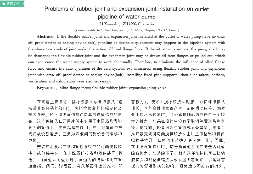 摘要:安裝在水泵出口端的可曲撓橡膠接頭或伸縮接頭,如未設(shè)置防拉脫和限位裝置(螺栓),在盲板力的作用下,管道系統(tǒng)有時(shí)可能會(huì)發(fā)生管道或設(shè)備偏移,嚴(yán)重的還可能會(huì)推壞泵殼或?qū)⒖汕鷵舷鹉z接頭由法蘭中拉出或?qū)⑸炜s接頭拉開(kāi),造成*水系統(tǒng)無(wú)法正常工作。因此為保證系統(tǒng)的安全運(yùn)行,可選用防拉脫的可曲撓橡膠接頭和帶限位的伸縮接頭或設(shè)置固定管架,并進(jìn)行必要的校核計(jì)算,以消除盲板力對(duì)管道系統(tǒng)的影響。